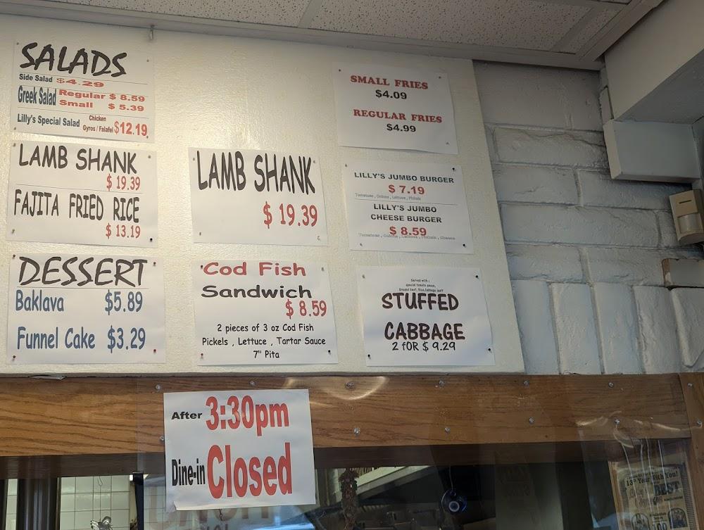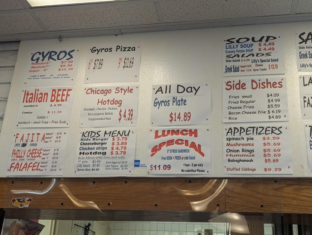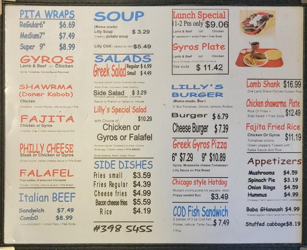 Lilly's Gyros menu delights with a variety of Mediterranean offerings. The highlight is the gyros plate, served with fresh vegetables and tasty sauces. The appetizers, including spinach pie and baba ghanoush, are perfect for sharing. The Greek salad is refreshing too!