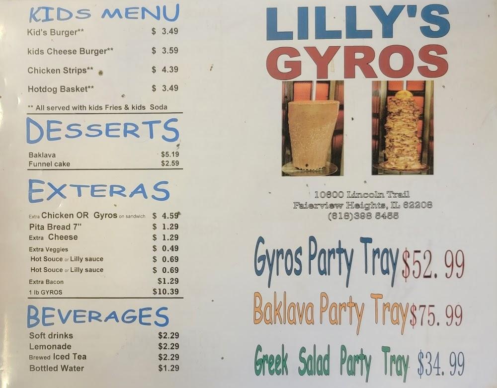 Welcome to Lilly's Gyros, your go-to destination in Fairview Heights for authentic Mediterranean cuisine. Specializing in gyros and traditional Greek fare, we offer a cozy atmosphere perfectly suited for family outings or solo lunches. Enjoy our diverse menu featuring local specialties, with options for dine-in, takeout, and delivery. Accessible to all, including wheelchair access and family-friendly amenities, we ensure a delightful dining experience for everyone. With affordable prices ranging from $10 to $20, come savor our mouthwatering dishes and relax in our friendly setting. Make a reservation today and discover the flavors of Lilly's Gyros!